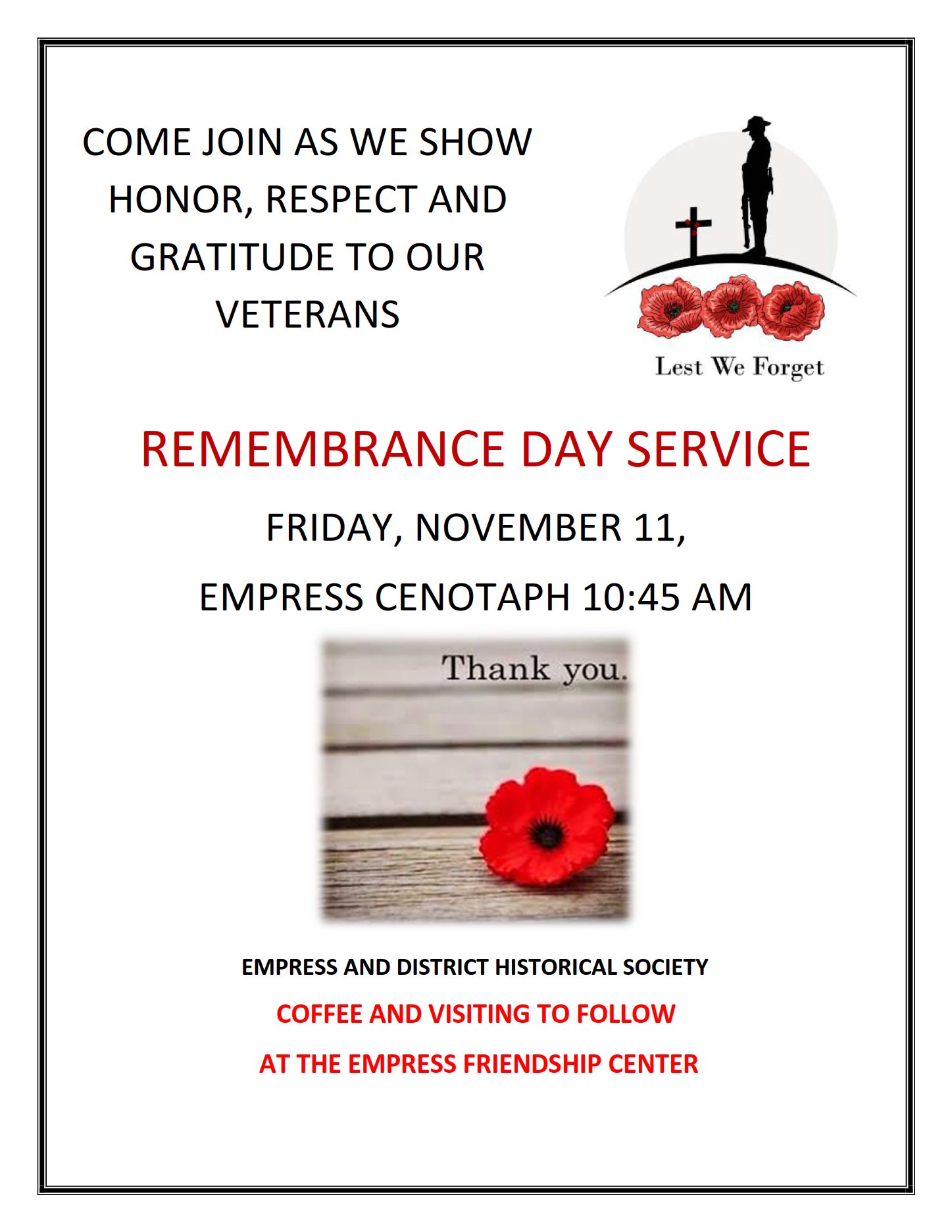 Rememberance Day Service Friday, November 11, 2022 @ 10:45 am Empress Cenotaph (by the old school), Google Map |