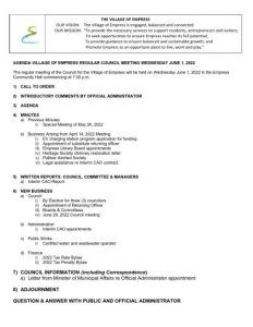 Please be advised of a Regular Council Meeting on Wednesday 1 June 2022 at 7:30 p.m. in the Empress Community Hall (314 Centre Street).