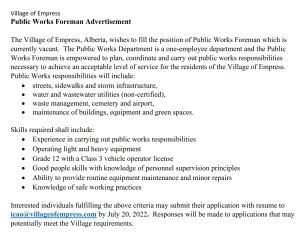 Posted on July 8, 2022 under: AnnouncementsThe Village of Empress, Alberta, wishes to fill the position of Public Works Foreman which is