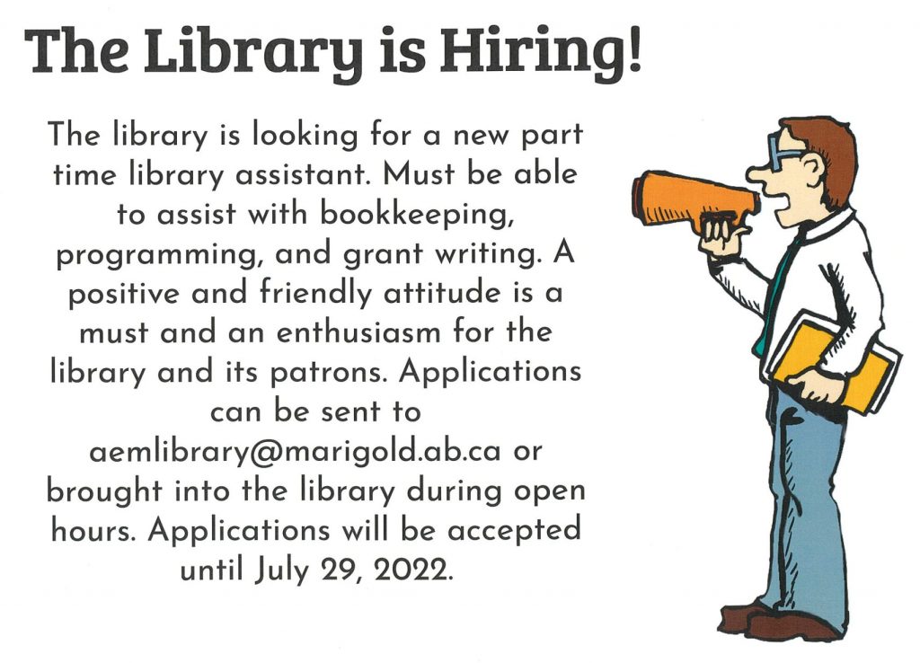 Posted on July 21, 2022 under: AnnouncementsThe Empress Library is hiring a part-time library assistant.