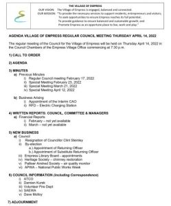 This will be a public meeting in the Village Office Meeting Room. Zoom is still not available. Due to the short notice, persons wishing to address council will need to wait until the May meeting. Agenda will be posted on Tuesday 12 April 2022.