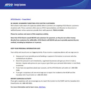 Posted on February 21, 2024 under: AnnouncementsScammers have targeted ATCO Electric customers.