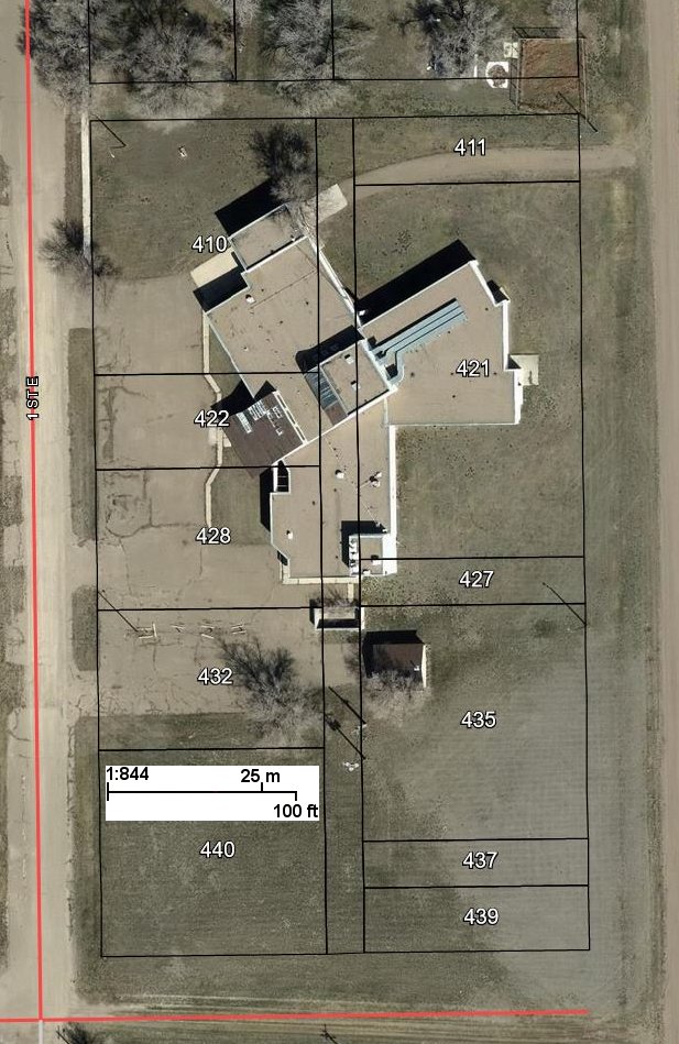 It sits on a large serviced property, including lot addresses on 1 Street East (410, 422, 428, 432, 440), and 2 Street East (411, 421, 427, 435, 437, 439).